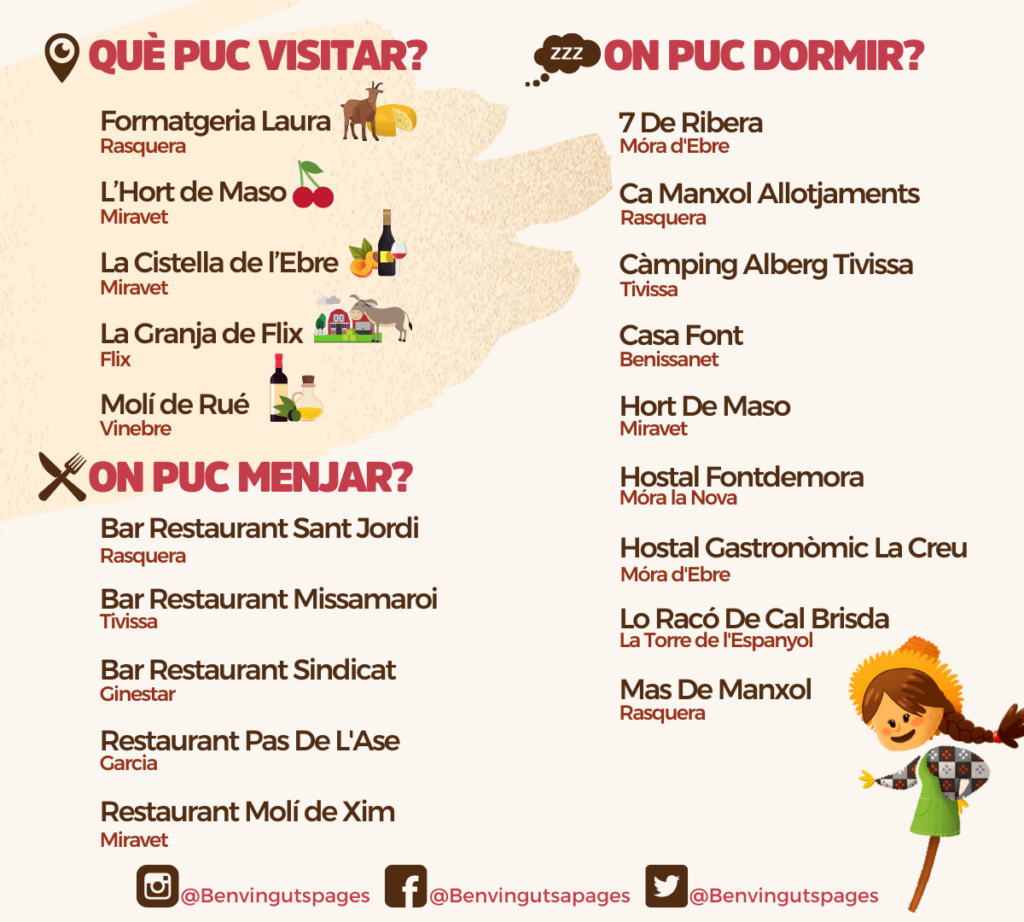 El cap de setmana del 2 i 3 d’octubre us convidem a Benvinguts a Pagès La Festa a la Ribera d’Ebre. Podreu visitar camps, ramats i conèixer ramaders i pagesos. Enguany us proposem realitzar la ruta de les Terres de l’Ebre, la qual uneix pobles de la Ribera d’Ebre i el Baix Ebre.